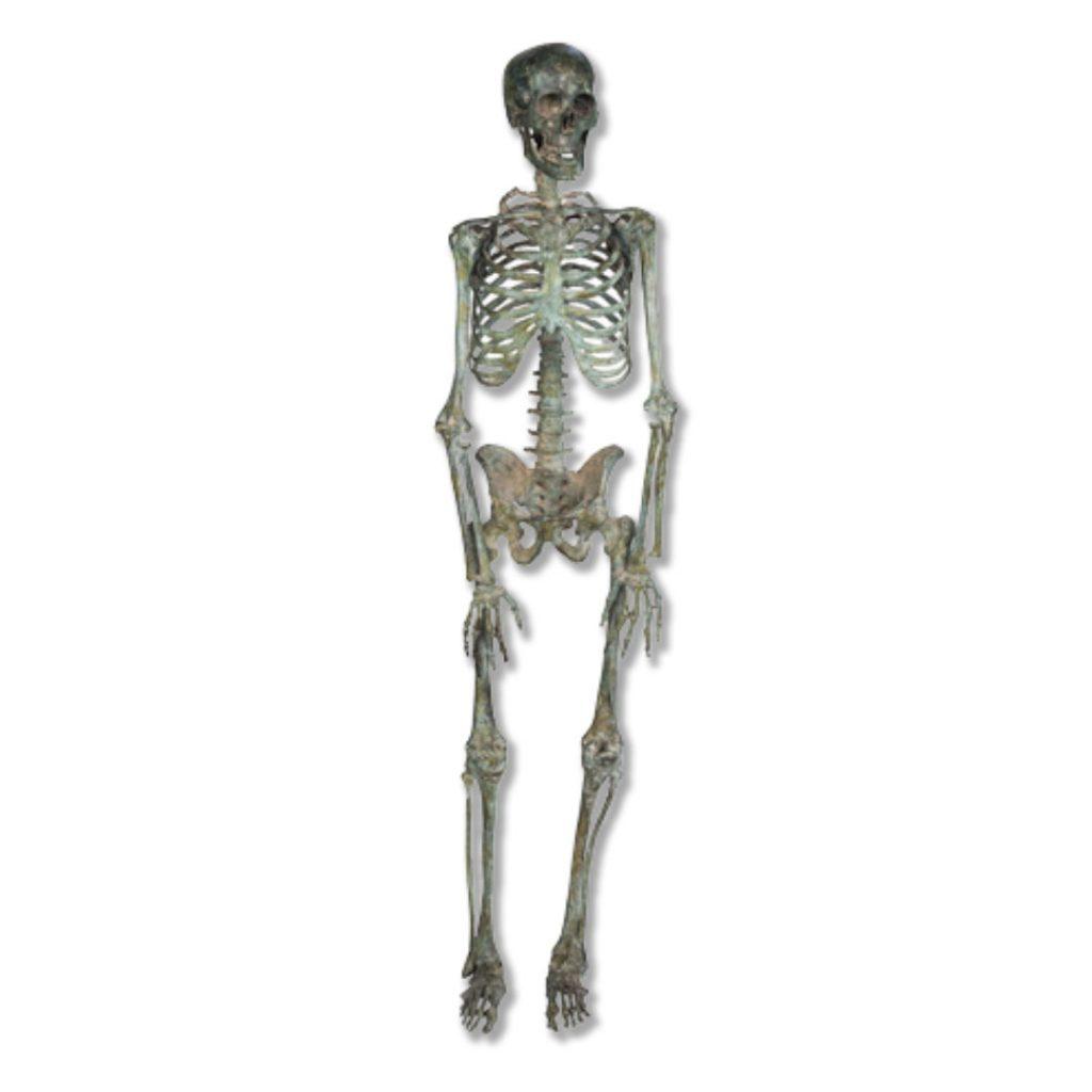 Human skeleton bronze sculpture in green patina, 20th century, measures 165 x 40 x 20cm.
