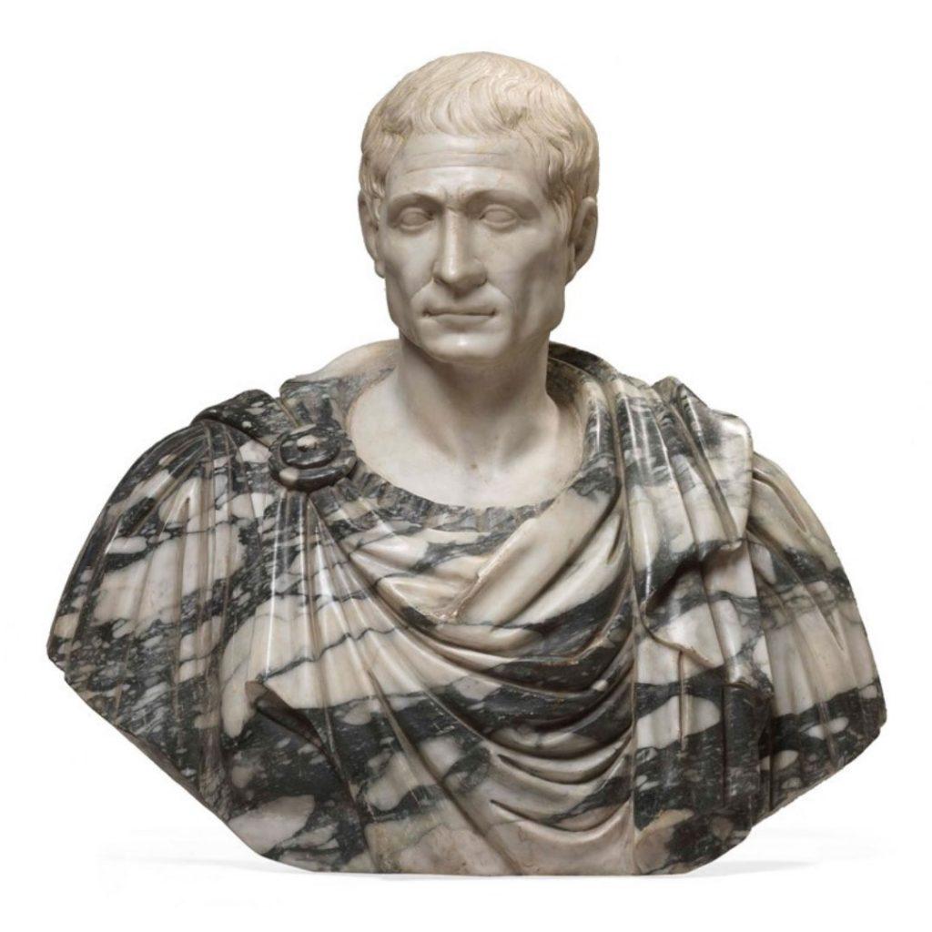 Busto di romano Cesare, marmo griggio, XIX secolo, misure 68 x 27 x 49.