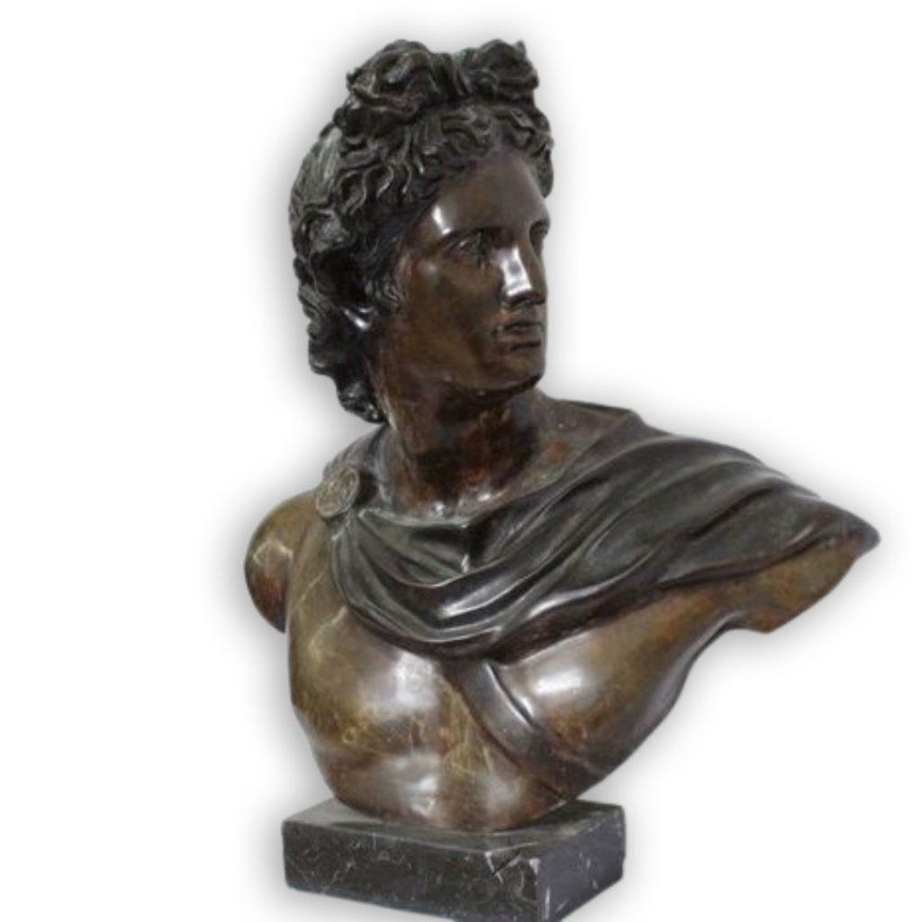 Patinated bronze bust sculpture, Apollo Belvedere, 20th century, measures 90 x 60 x 30cm