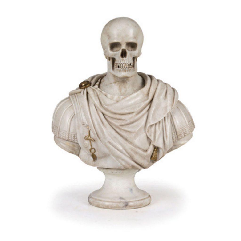 Roman bust with skull head in white marble with gold decoration, 20th century.