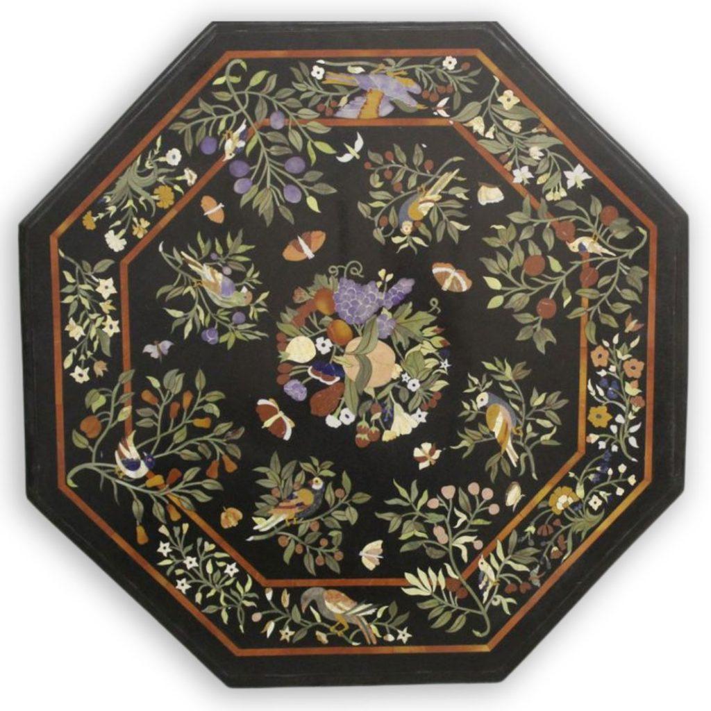 Octagonal black marble top with semiprecious stones, Florentine school 70’s workmanship, measures 100 x 100 x 3cm.