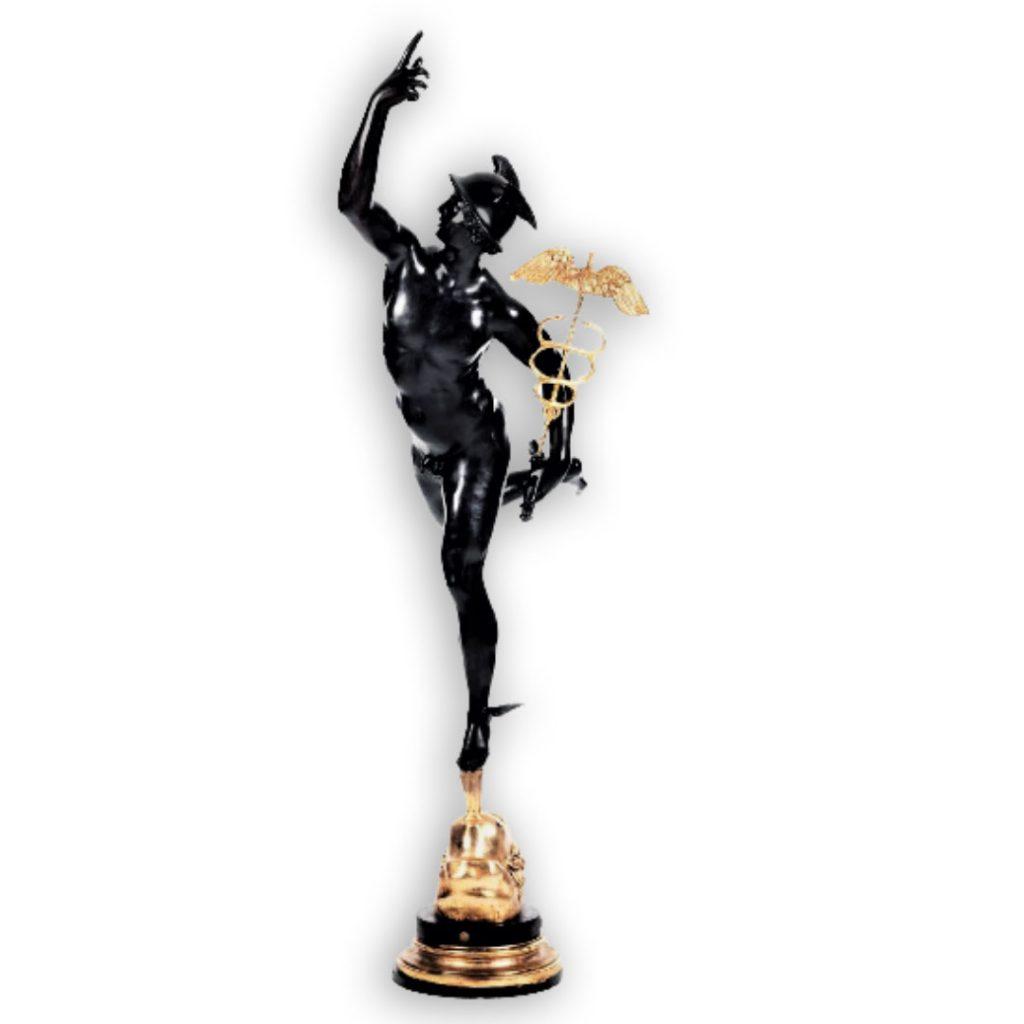 Scultura di grande Mercurio, rifinito con parti in bronz lucidato e parte di bronzo brunito, metà del XX secolo, misure 183 x 115 x 40cm.
