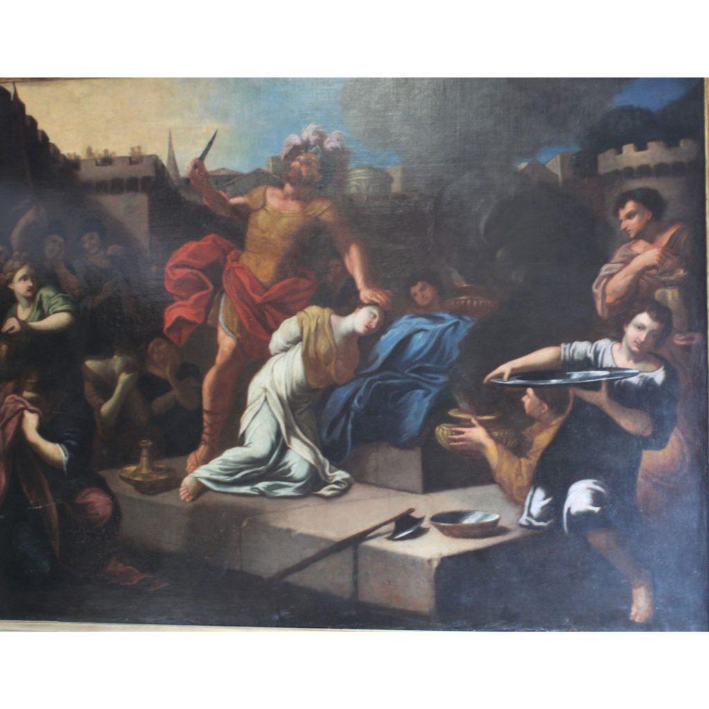 Dipinto Sacrilegtio di Ifigenia, olio su tela, probabile pittore bolognese, XVII secolo, misure 110 x 160cm.
