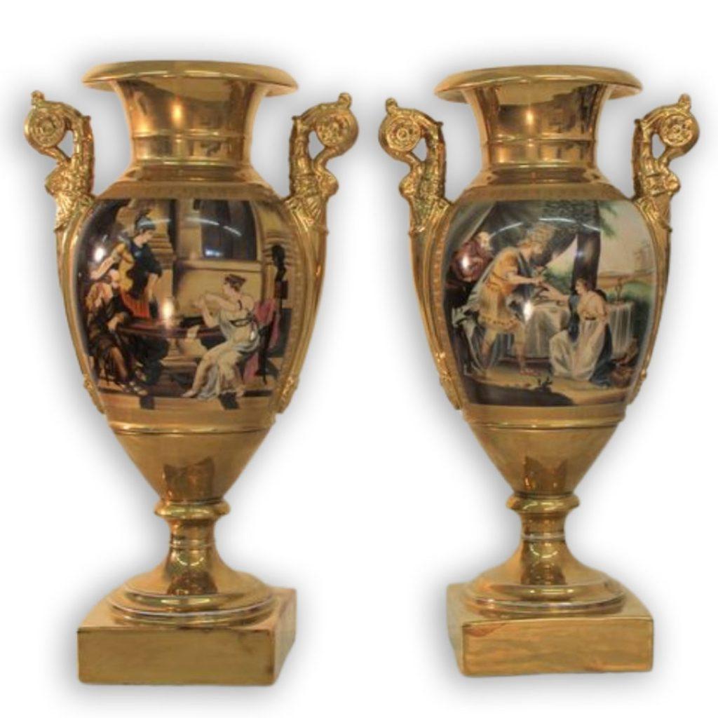 Coppia di vasi in porcellana dorata, inizio XX secolo, tutto coronato da un fantastico dipinto in ogni lato di scene mitologici, misure 55 x 28 x 25cm.