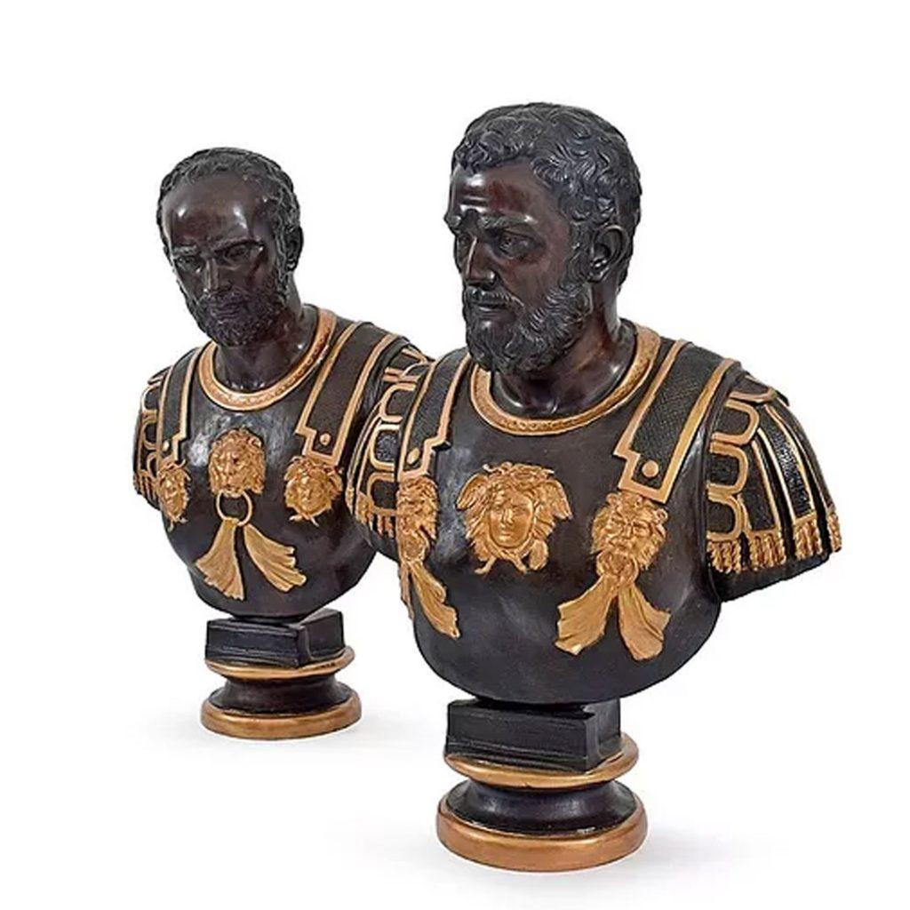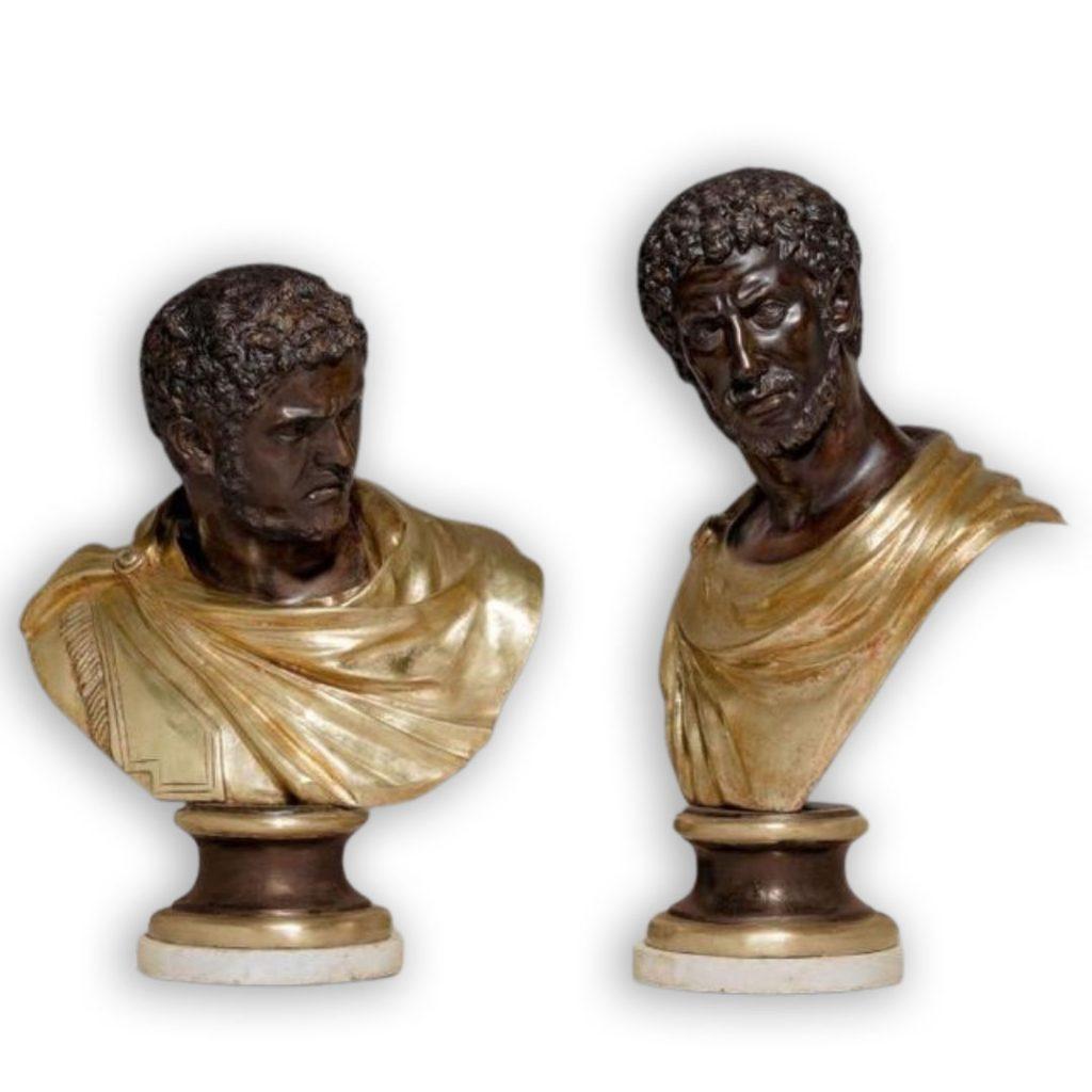 Pair of fantanstic bronze sculptures of ancient Romans with part of the bust in gilded bronze and part in patinated bronze with white marble base, Rome 19th century, measures 60 x 50 x 27cm.