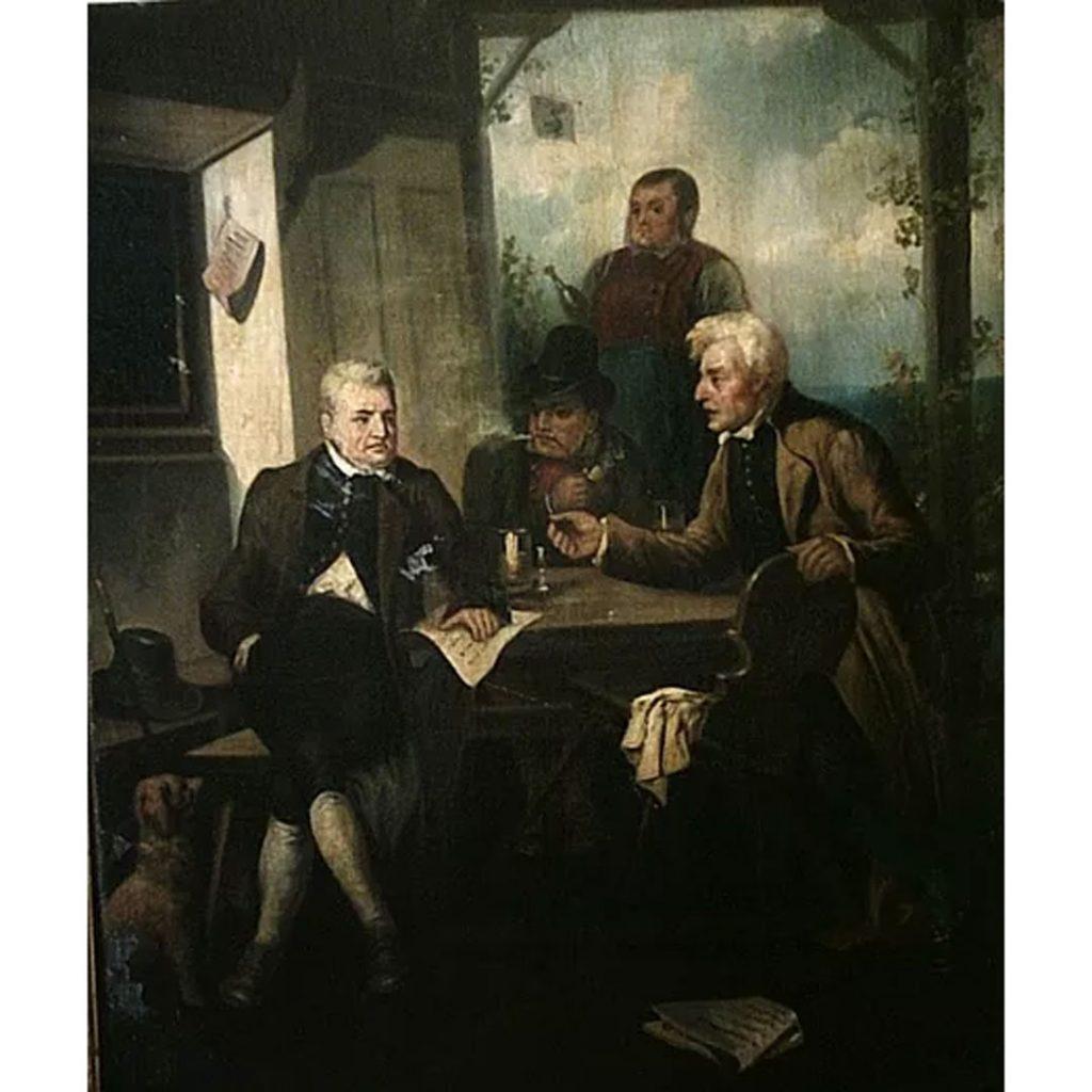 Dipinto olio su tela, raffigura discussione d’affari in taverna inizio XIX secolo, firma poco leggibile, misure 90 x 60cm.