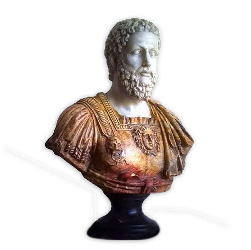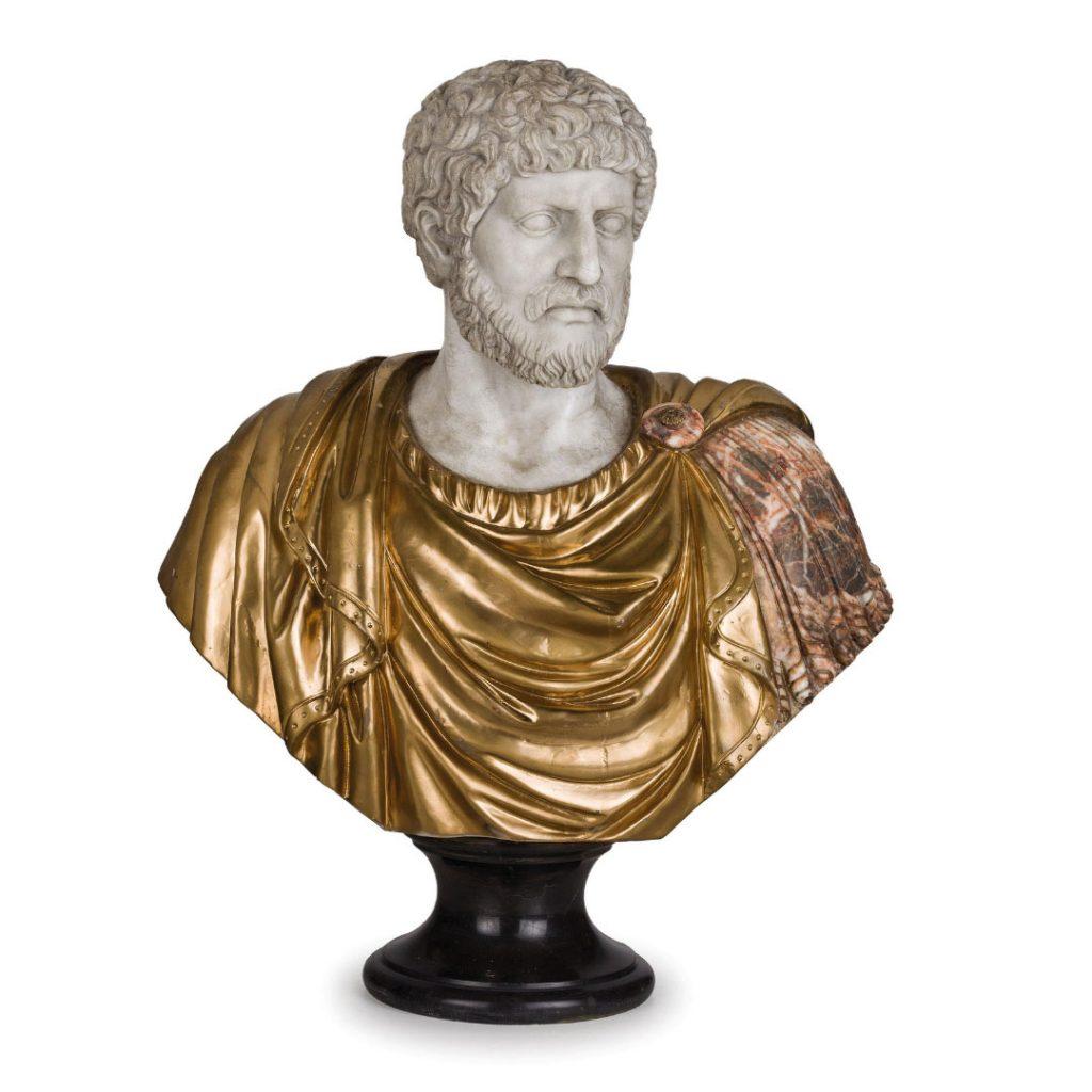 Detail bust in marble of Antoninus Pio, with drapery in gilded marble, and head in white marble, shoulder in antique green marble, bronze boss for mantle support, black marble base measures 83 × 60 × 30 cm