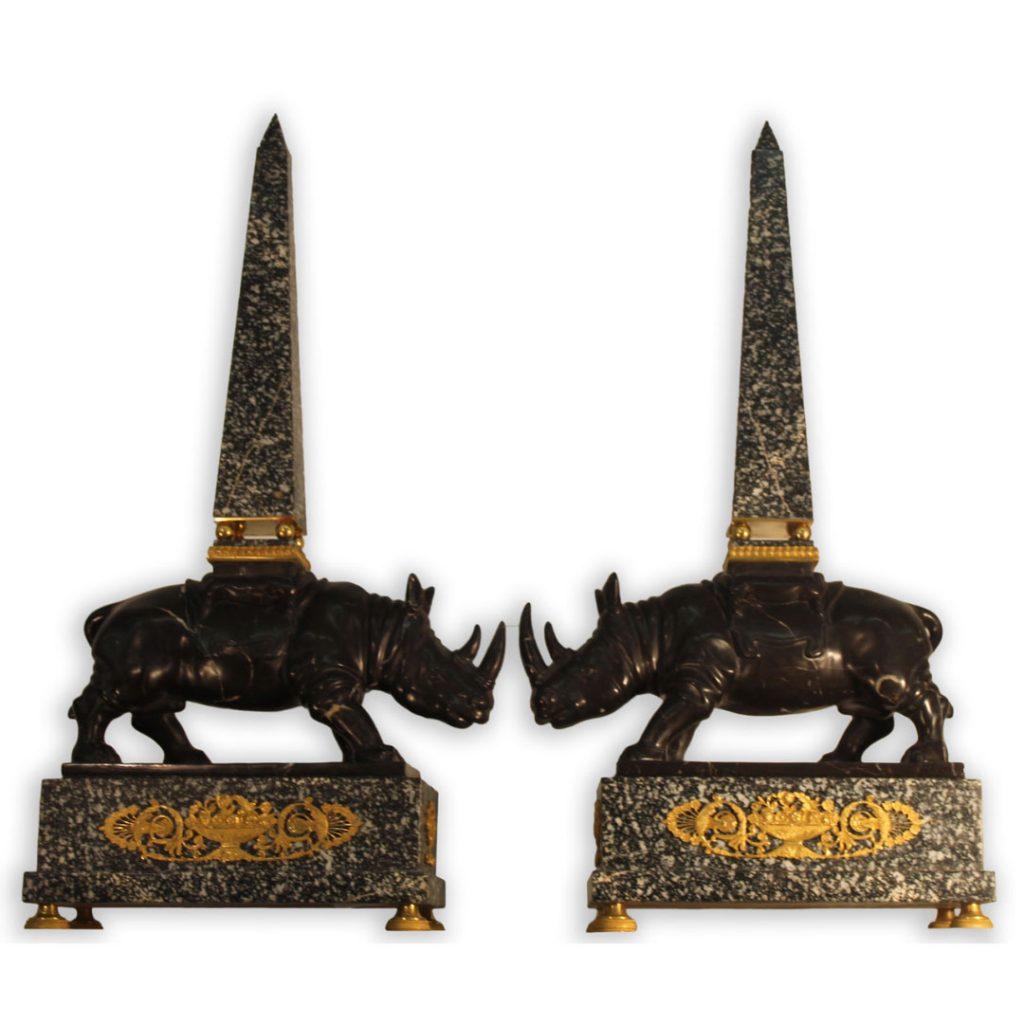 Straordinaria coppia di obelischi, in porfido nero, con rinoceronti in marmo nero, rifiniture in bronzo dorato e cesellato misure 80x 35×20.