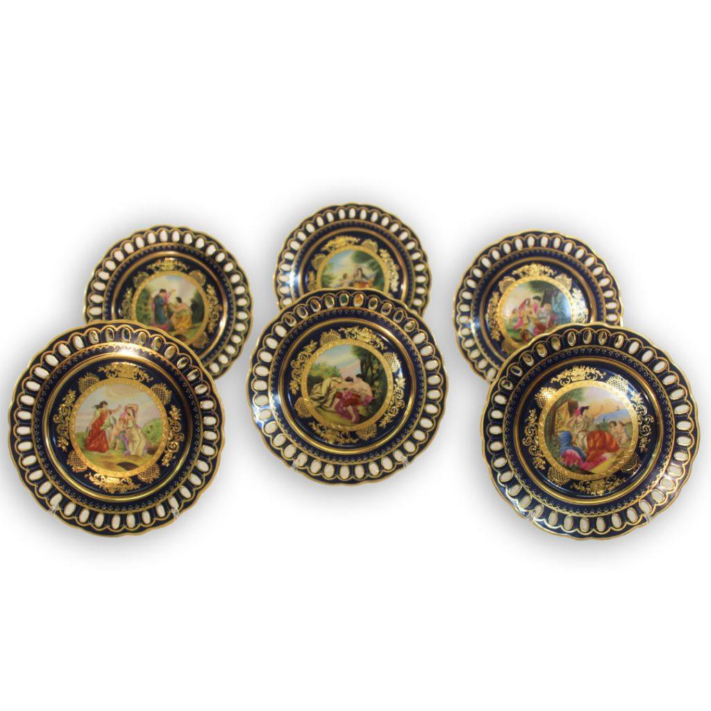 Servizio di sei piatti in porcellana blu oro e miniature,metà del xx secolo diametro 30 cm
