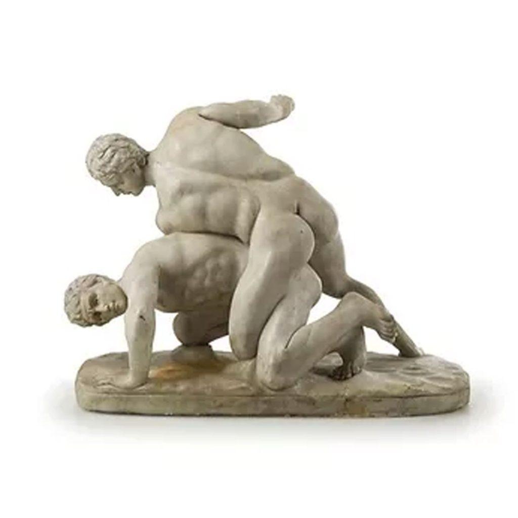 Wrestlers in marble, unknown author, rare white marble sculpture, measures 70 × 110 × 60 cm.