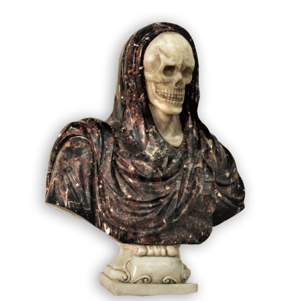 Scultura di Vanitas in marmo con panneggio in marmo rossolevanto e teschio in marmo bianco, inizio XX secolo. Misure 70 x 45 x 30.