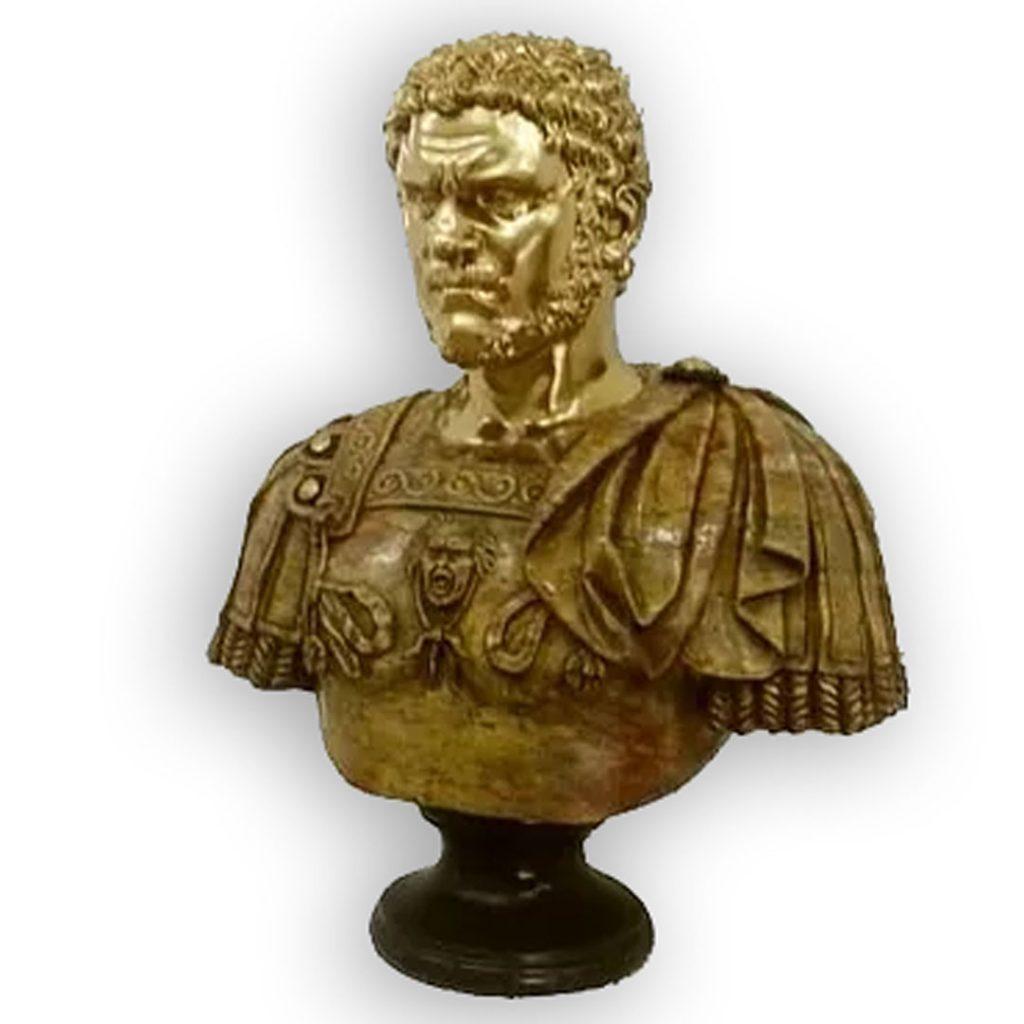 Busto Imperatore Romano Caracalla, su una base tonda di pietra nero, il busto di marmo Giallo realizzato dell’imperatore che guarda avanti, il suo mantello chiuso da un fermaglio sulla spalla destra. Dettagli in bronzo dorato, così come la testa in dorata, misure 90 x 55 x 35
