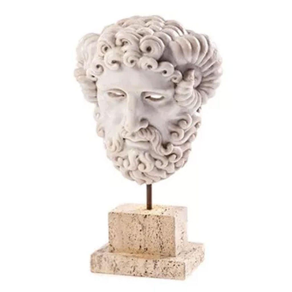 Sculpture of a Greek god with a goat’s head in white marble, late 19th century. Measures 35 x 28 x 12cm