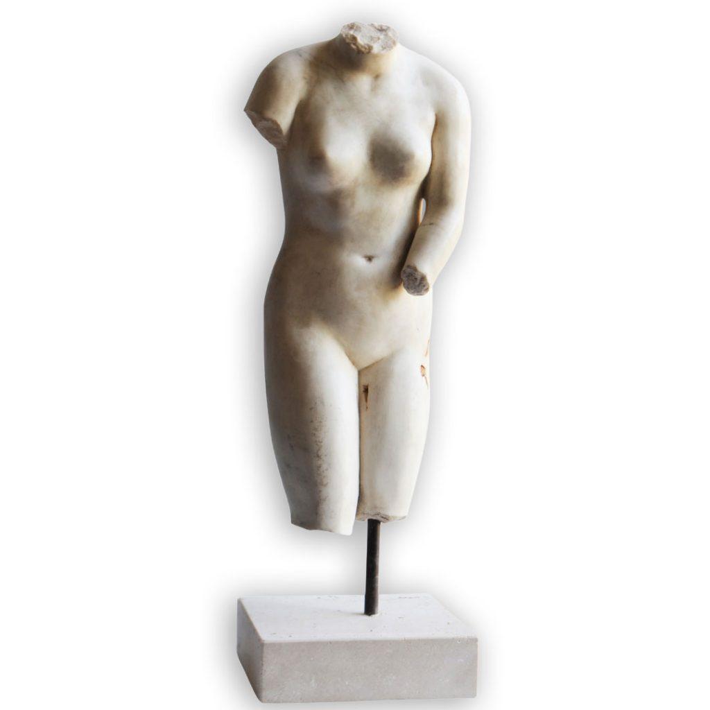 Female torso in antiqued Carrara marble inspired by the famous “Medici Venus”, measures 73x24x24