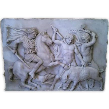 High relief in white marble with hunting scenes, early 20th century, measures 65 x 40cm