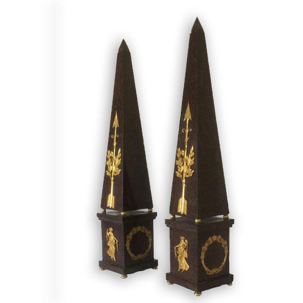Grandi obelischi in porfido egiziano rosso con bronzi dorati e cesellati, xx secolo, misure 130 × 30 × 30 cm