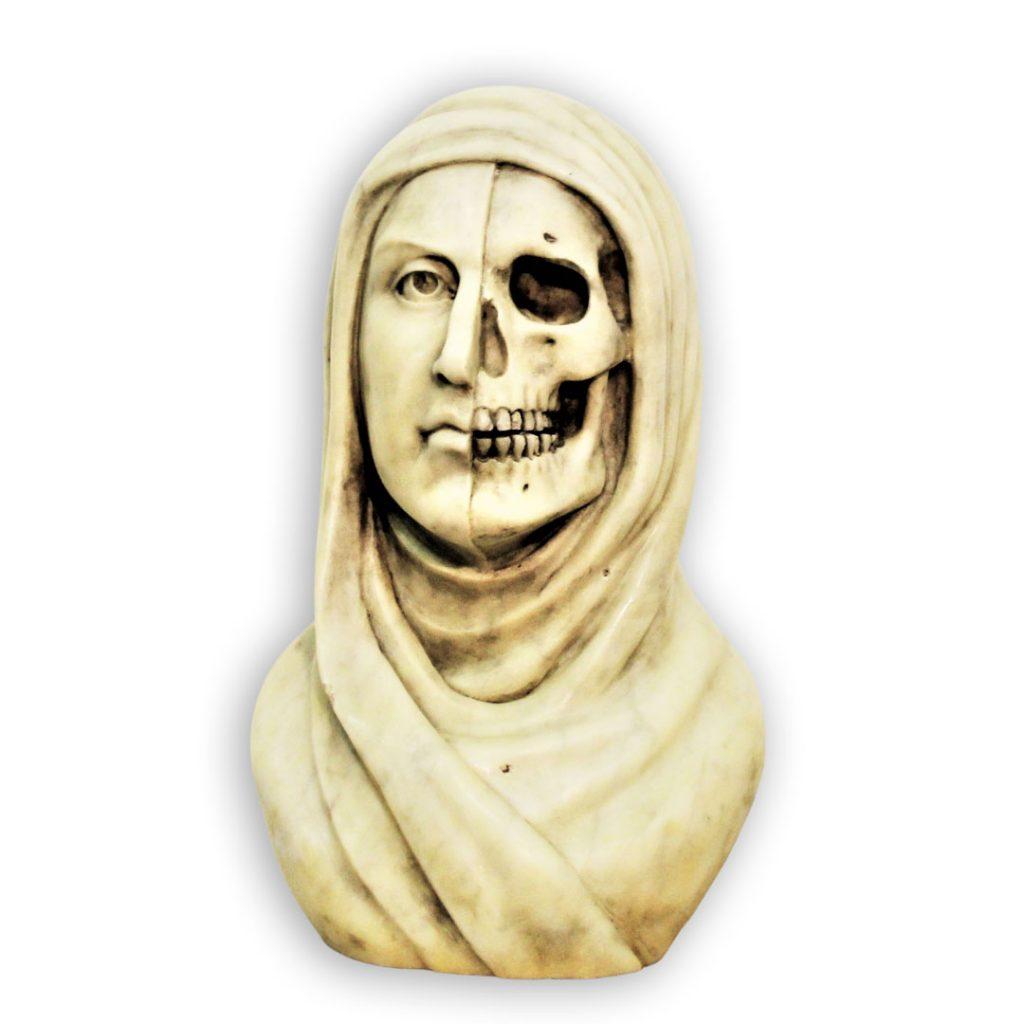 Vanitas in marmo, mezzo teschio mezzo volto di donna, in marmo di Carrara, inizio XX secolo, misure 55 x 27 x 30cm.